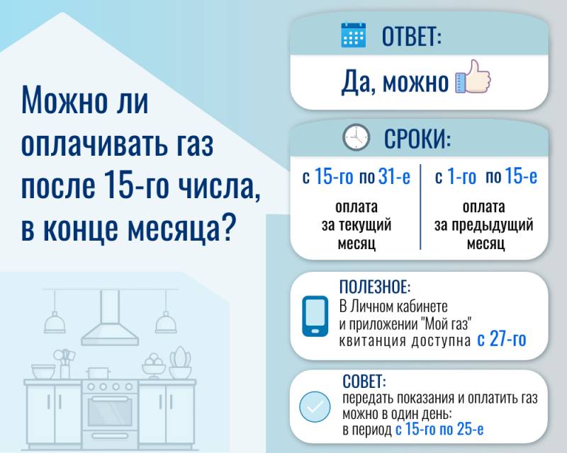 Отвечаем на этот вопрос Да, оплатить газ можно и позже 15 числа, но важно понимать, за какой период вы платите. 1. Газ, потребленный в текущем месяце, можно оплатить с 15 до 31 числа. Например, в марте – до 31 марта. 2. Если расчетный месяц завершился, то оплатить газ нужно с 1 до 15 числа. Например, в апреле нужно оплатить газ, потреблённый в марте, с 1 до 15 апреля. Что происходит при просрочке • начиная с 31 дня задолженности начисляется пеня • сумма пени увеличивается каждый день • при длительной неоплате возможны ограничения подачи газа Простой пример: Если есть долг, даже небольшой, пеня будет добавляться ежедневно, пока он не погашен. Чем дольше не оплачивать — тем больше итоговая сумма. Как избежать лишних расходов - проверяйте начисления заранее - оплачивайте газ в установленные сроки и в полном объеме — так вы экономите деньги и избегаете лишних хлопот. - удобно делать это в день передачи показаний — с 15 по 25 число Узнать сумму к оплате можно в Личном кабинете https://мойгаз.смородина.онлайн/ или приложении «Мой газ». https://мойгаз.смородина.онлайн/apps. | |