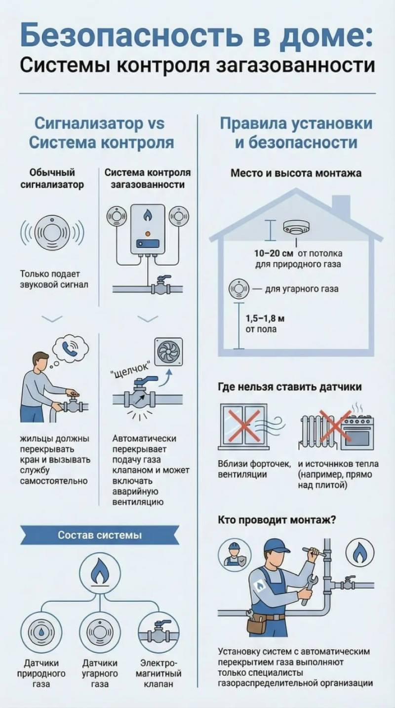 Дата публикации: 3 апреля 2026 ![]() Сигнализатор загазованности — это базовая защита: он подаст громкий сигнал, если концентрация газа (метана или угарного) превышена. Дальше действовать нужно самостоятельно: перекрыть газ, проветрить помещение и вызвать аварийную службу. Система контроля загазованности — более продвинутое решение. Она не только предупреждает, но и может автоматически предотвратить опасную ситуацию: - перекрывает подачу газа - включает вентиляцию (при наличии) - в некоторых случаях отправляет уведомление на смартфон Что входит в систему: - датчик горючего газа - датчик угарного газа - электромагнитный клапан Важно: - оборудование работает от сети 220В - датчик газа устанавливается под потолком (10–20 см) - датчик угарного газа — на уровне дыхания (1,5–1,8 м) - не размещайте датчики рядом с окнами, вентиляцией и источниками тепла Обратите внимание: простые сигнализаторы можно установить самостоятельно, а системы с автоматическим перекрытием газа — только с участием специалистов вашей газораспределительной организации. Газ - это безопасно, если знать правила. Телефон экстренной газовой службы 104. |